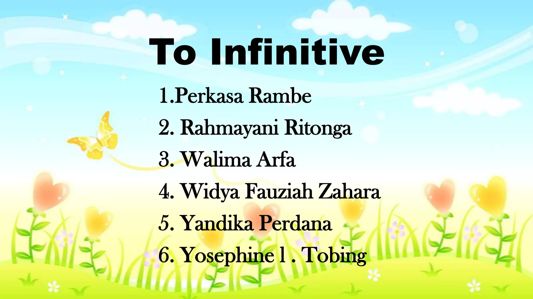 This document defines and explains the use of to infinitives in English grammar. It begins by defining to infinitives as verbs preceded by "to", such as "to sing" or "to go". It then lists several verbs that must be followed by a to infinitive, such as "want", "plan", and "hope". The document outlines different patterns that to infinitives can take, including subject+verb+to infinitive. It also discusses where to infinitives can be placed and their different functions as objects, subjects, subject complements, and complements of nouns and adverbs. In closing, it invites any questions about to infinitives.