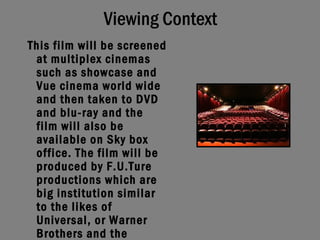 The film is a psychological thriller called "The Treatment" with a budget of £110 million produced by a major studio. It will focus on a possessed young girl and her father, who murdered the girl's mother. The film aims to make audiences uncomfortable by setting ordinary domestic scenes and then adding frightening elements. It will have a dark and mysterious plot that does not provide closure. The style will create an eerie atmosphere through settings like an old house, costumes, and lighter lighting as conditions allow.
