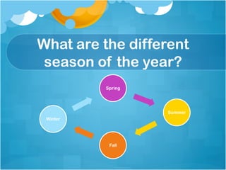 The document discusses the four seasons of the year - spring, summer, fall, and winter. It lists the months associated with each season and describes common weather patterns, including whether it is sunny, rainy, cloudy, windy, and what temperatures are usually felt during each season.