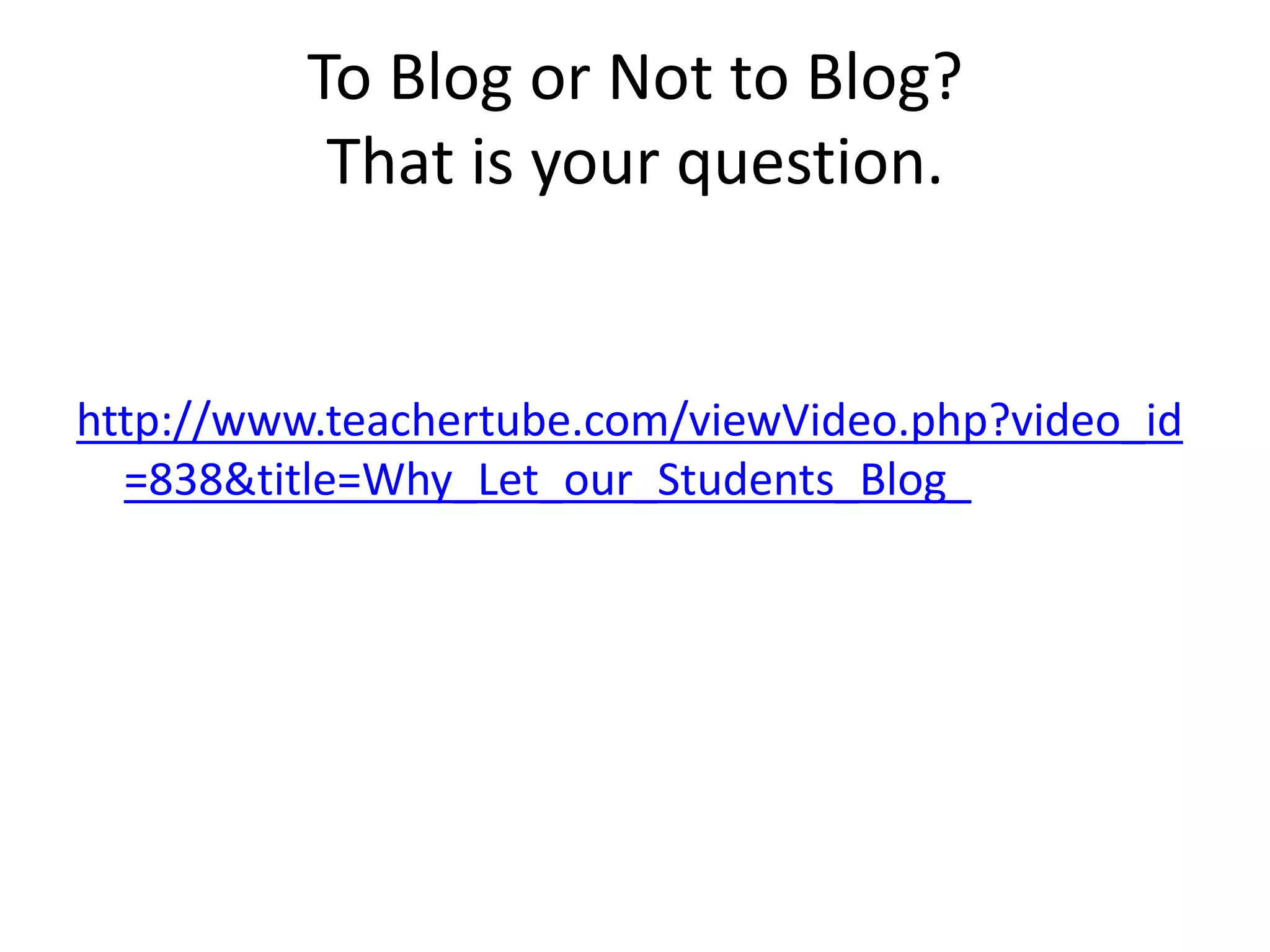 Blogging can provide many educational benefits for students including increased motivation, opportunities to read and write, and enable collaboration. Teachers are using blogs in their classrooms in several ways such as replacing traditional class websites, linking to related internet resources, organizing class discussions, and having students write their own blogs. Blogs are an attractive tool for both education and the internet in general due to their ease of use which allows users to easily update and edit content without worrying about formatting or code. Both students and teachers express positive views about using blogs in the classroom with students enjoying writing reviews and teachers believing it prepares students for the future.