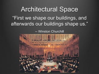 The document discusses the different types of architectural space, including physical space, perceptual space, conceptual space, behavioral space, interwoven space, static space, directional space, non-directional space, positive space, and negative space. It also discusses the three basic elements of architecture according to Vitruvius: strength, utility, and grace. Strength refers to the physical structure and foundations of a building. Utility refers to the functional arrangement of rooms and spaces. Grace refers to how architecture engages the senses and shapes our experience of the built environment.