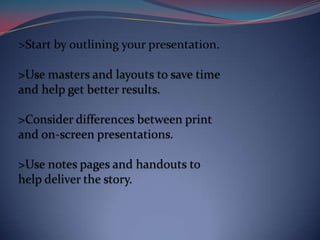 The document provides tips for creating effective PowerPoint presentations. It recommends keeping presentations concise with sparse text on each slide. No more than 8 lines with 8-10 words per line is suggested. Graphics and charts should be limited as well, with additional details provided in handouts if needed. The presentation should tell a story with a clear beginning, middle, and end, and focus on the speaker augmenting the slides rather than relying on them.