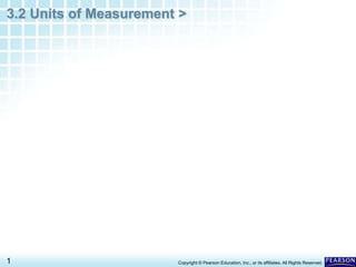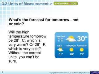 The document discusses various units of measurement used in science, focusing on metric units known as the International System of Units (SI). It describes the seven base SI units including the meter for length, kilogram for mass, and kelvin or degree Celsius for temperature. Derived units are defined in terms of the base units, such as cubic meters for volume and joules for energy. Common metric prefixes are used to denote multiples of units, such as milli- for thousandths and kilo- for thousands. Specific units are discussed for common measurements like liters for volume and grams for mass.