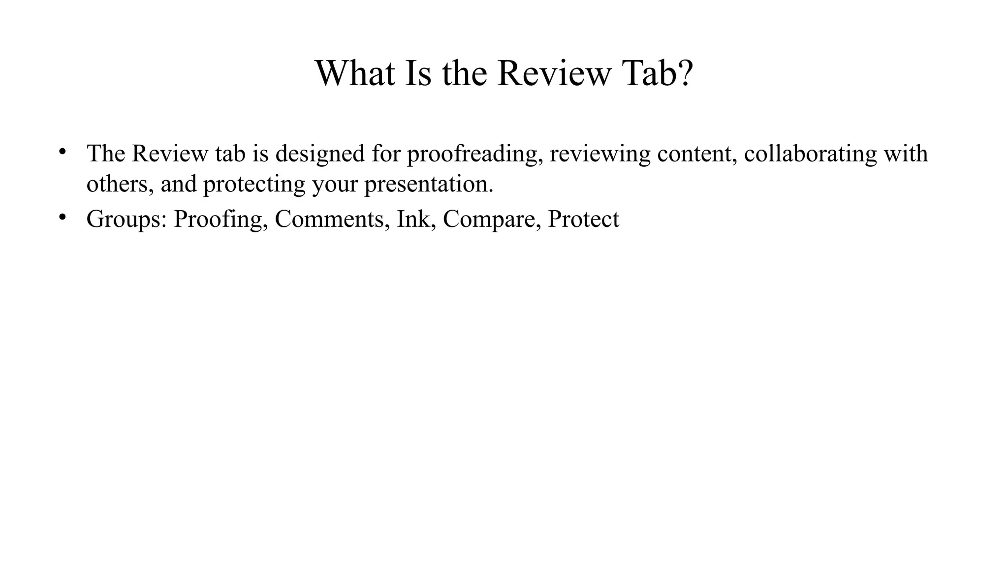 • The Review tab is designed for proofreading, reviewing content, collaborating with