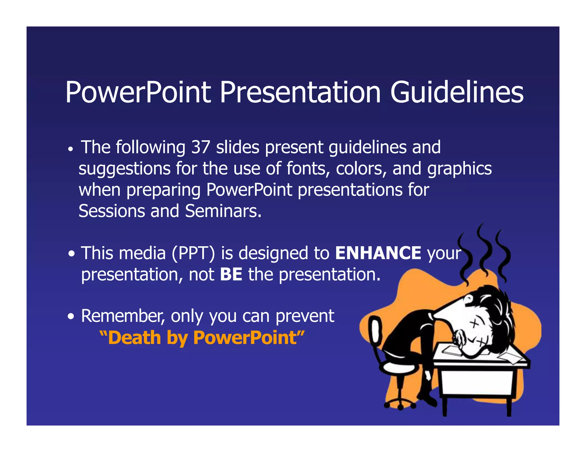 - Remember that the presentation enhances the speaker, not replaces them. Avoid reading slides verbatim.
