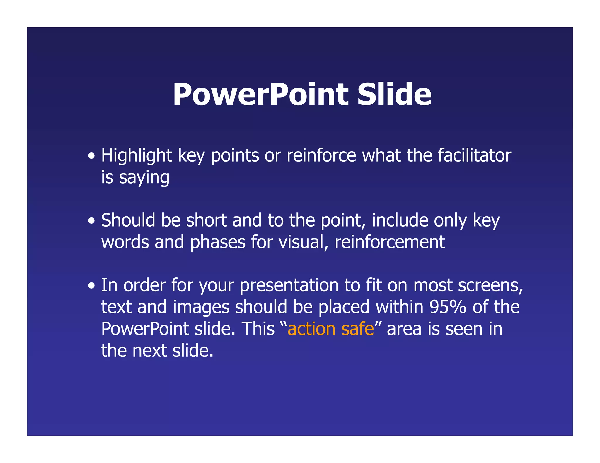 - Limit each slide to one main idea with bullet points to reinforce the speaker's message. Keep bullets brief and use consistent formatting.