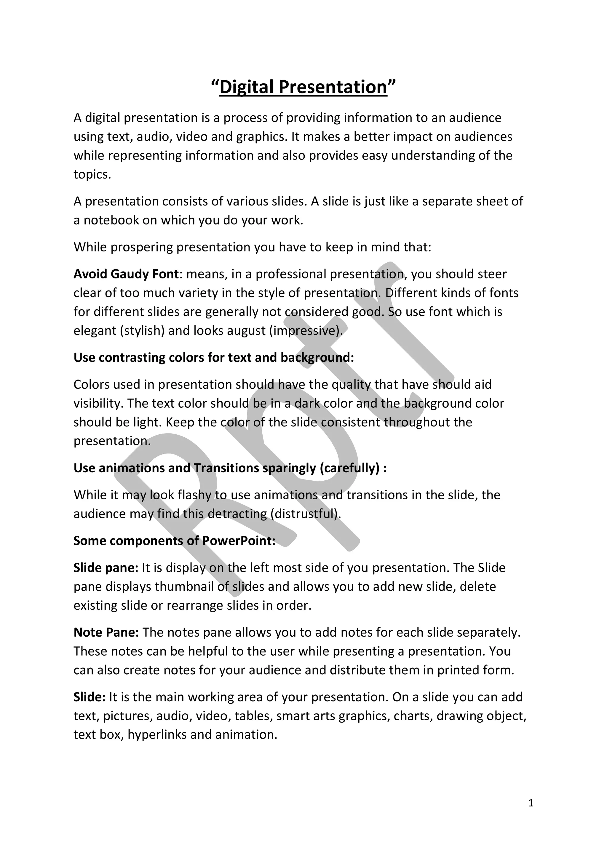 A digital presentation uses text, audio, video and graphics to provide information to an audience. It consists of slides that each display content separately. When creating a presentation, it is important to use an elegant font, contrasting text and background colors, and animations sparingly. PowerPoint allows creating presentations through features like slides, slide layouts, notes, and different views. A slide show can be run from the start or a specific slide and custom slide shows can also be created.