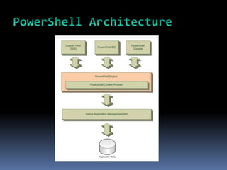 This document provides an introduction to PowerShell, including what it is, its core components like cmdlets and objects, and how it can be used for automation and management. PowerShell combines a command-line shell and a scripting language that allows users to discover, query, and manipulate systems through a .NET object model. It includes cmdlets for common system tasks and can be extended with additional cmdlets. PowerShell is included with Windows 7/Server 2008 R2 and later or can be installed on earlier versions, and will be important for IT professionals to learn as it replaces traditional shells.