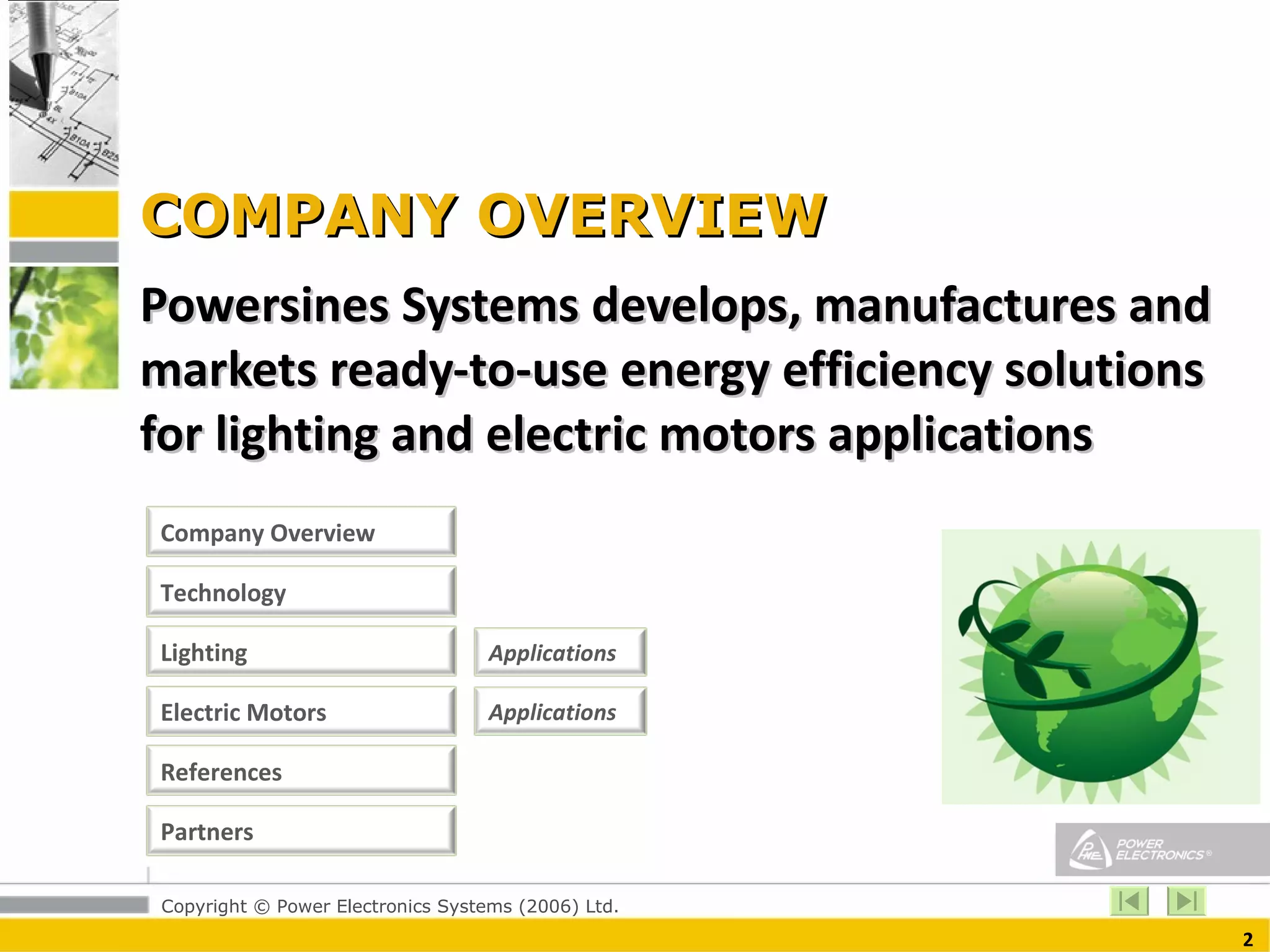 Powersines Systems develops and markets energy efficiency solutions for lighting and electric motors. Their patented voltage control technologies help stabilize voltage and reduce it by up to 35%, saving 15-35% in energy costs. Their compact lighting energy controllers can be easily installed on existing infrastructure and provide verified savings and a return on investment of 1.5-2.5 years. Over 23,000 of their systems have been installed globally in various applications such as street lighting, retail stores, and industrial facilities.