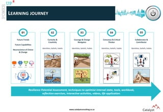 This document provides information about an online learning journey called "Powerup 8" focused on developing 8 critical capabilities for navigating an unpredictable world. It includes sections on curiosity and creativity, future trends, skills of the future, fears of change, calibrating fears, the courage muscle, comfort zones, and developing habits to strengthen capabilities like being curious, creative, and courageous. The overall content discusses building resilience and adaptability for an uncertain future through developing important mindsets, skills, and habits.