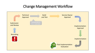 This document outlines the key steps in a project management workflow including initiation, planning, execution, control, and closure. It involves defining parameters, developing an initial project plan, refining the plan and parameters, managing execution through daily meetings and status reports, performing a final assessment, and archiving project information. A separate section describes a change management workflow involving definition, planning, building and testing, approvals, implementation, and post-implementation evaluation.