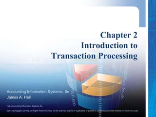 This document discusses chapter 2 of the textbook "Accounting Information Systems, 8e" by James A. Hall. The chapter introduces transaction processing and accounting information systems. It describes the three transaction cycles of expenditures, conversion, and revenues. It also discusses the traditional accounting records used in transaction processing systems and how they relate to their digital equivalents. The chapter covers documentation techniques for accounting information systems like entity relationship diagrams and data flow diagrams. It contrasts batch and real-time transaction processing and their impacts on accounting systems.