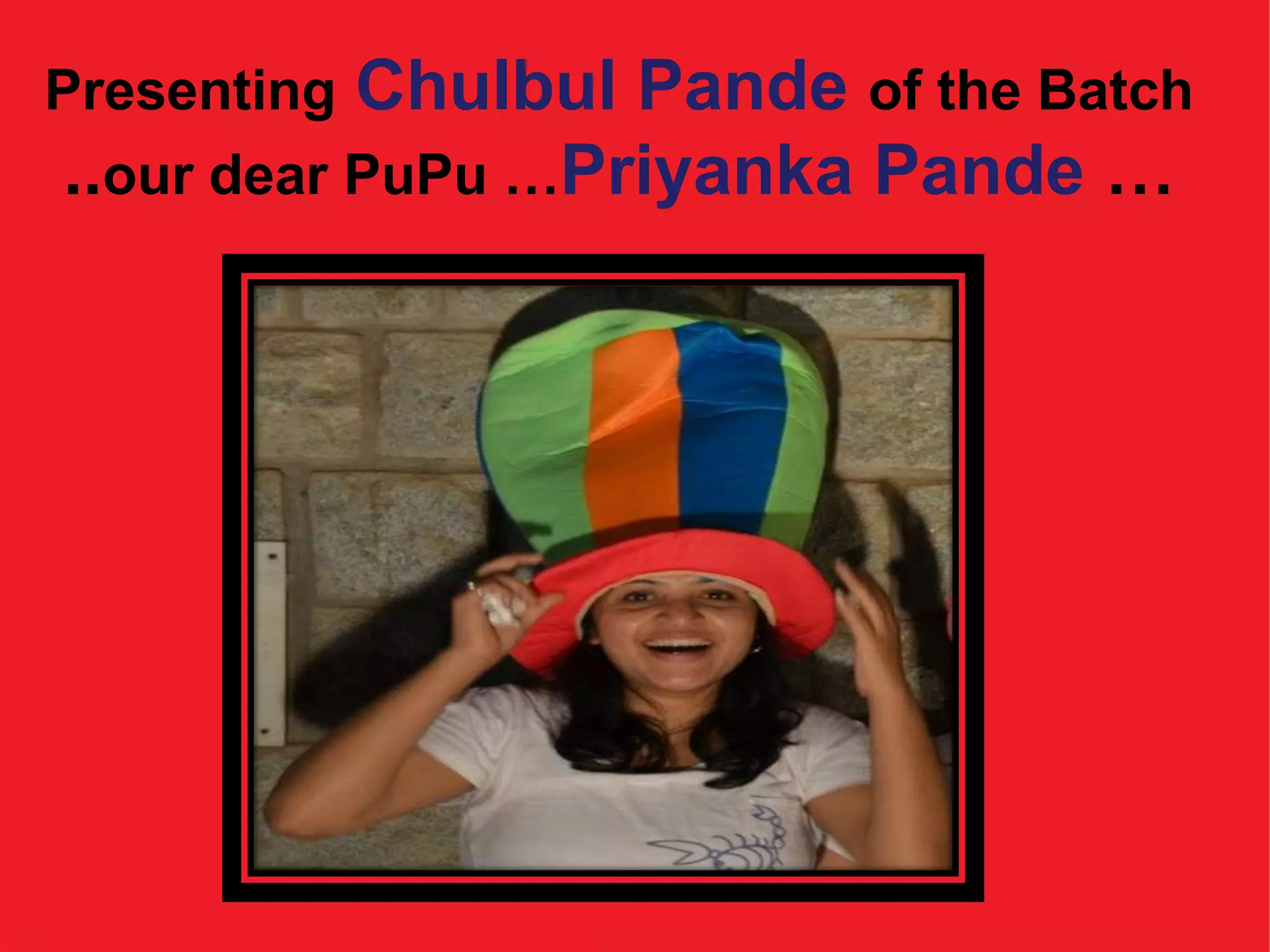 Priyanka Pande was known at IIM Bangalore for being extremely dedicated to her health and fitness routine, often being the first to wake up, eat, leave class, and go to sleep each day. She would go to the gym for hours daily and add extra exercise if she ate sweets. While focused on fitness, she also served as the "Facebook Queen" and tried to maintain many friendships, eventually finding a true partner. The document wishes her the best in her future.