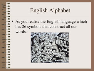 The document provides information about the Chinese alphabet and writing system. It discusses how the Chinese writing system developed from ancient pictographs into a system with over 50,000 characters. Unlike the English alphabet, Chinese characters represent whole words rather than individual sounds. The document also notes that the Chinese writing system allows people speaking different dialects to communicate in writing. It traces the origins of Chinese writing to around 4500 years ago and describes how ancient texts carved on oracle bones from that era can still be translated into modern Chinese.