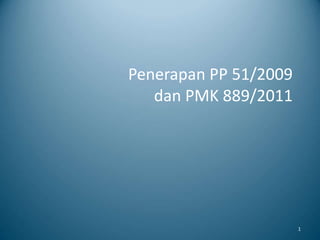 Dokumen tersebut membahas tentang peraturan pelaksanaan pekerjaan kefarmasian di Indonesia seperti PP 51/2009 dan PMK 889/2011. Dokumen tersebut mengatur tentang persyaratan, prosedur, dan pelaksanaan pekerjaan kefarmasian oleh tenaga kefarmasian seperti apoteker dan tenaga teknis kefarmasian.