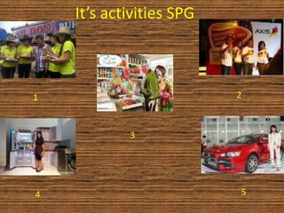 This document discusses the activities, place, and clothes of an SPG organization. The activities include two main points, the place has two details, and the clothes have three brief descriptions. However, the document provides minimal context and no specifics about the SPG organization, its purpose, or the nature of the activities, place, and clothes.