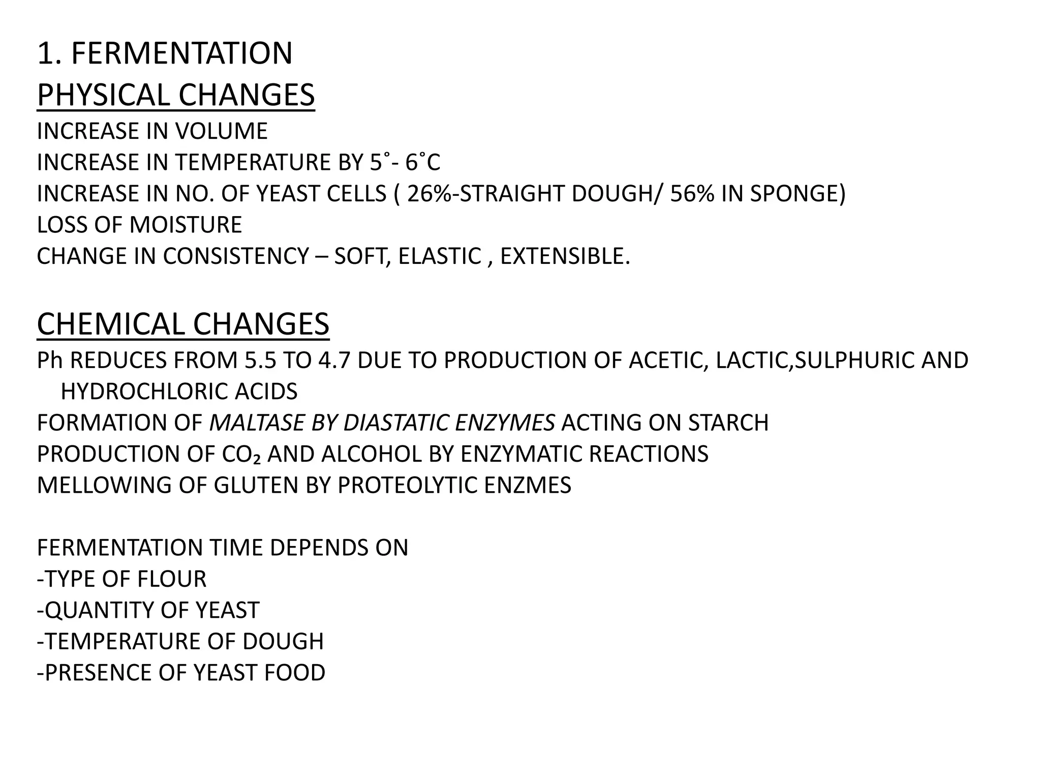 1. Fermentation involves physical and chemical changes as yeast converts sugars into carbon dioxide and alcohol, causing the dough to rise in temperature, volume, and soften in consistency.