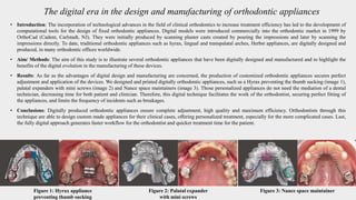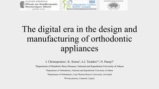 The document discusses the digital era in the design and manufacturing of orthodontic appliances. It outlines how technological advances have led to computational tools for designing fixed orthodontic appliances digitally. The authors aim to illustrate appliances they have digitally designed and manufactured, such as a Hyrax appliance, palatal expanders with mini screws, and Nance space maintainers. The benefits of digital design and manufacturing include producing customized appliances with perfect fit and adjustment, decreasing time for both patients and clinicians, and limiting incidents like breakages.