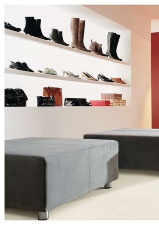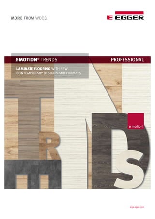The document describes EGGER laminate flooring, highlighting new contemporary designs and formats in their Emotion Trends collection. It provides details on several flooring collections including Classic, Medium, and Block formats with various wood grain patterns. Product specifications, installation methods, and advantages of laminate flooring are listed. Contact information for EGGER retail locations is also included.