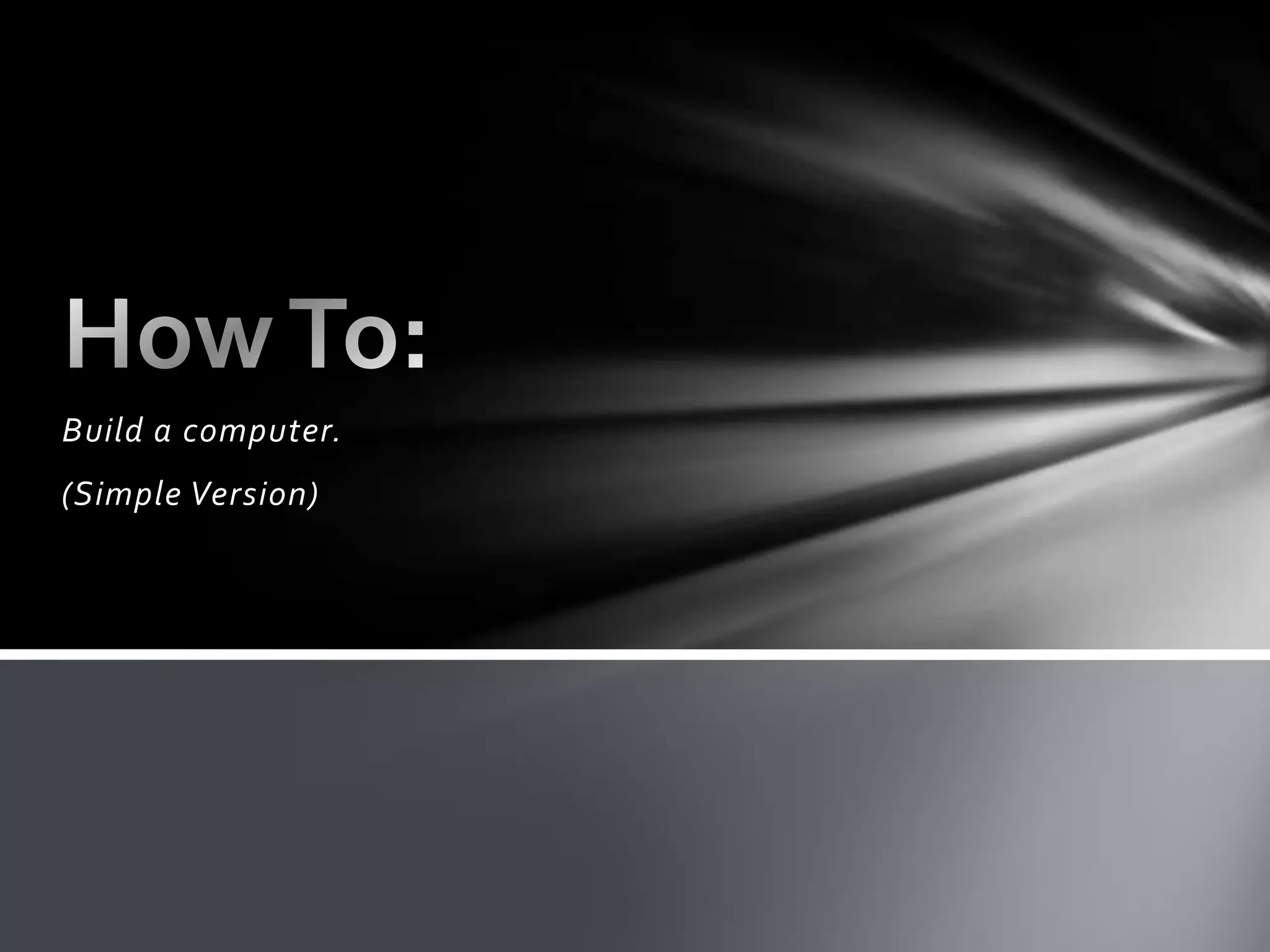 The document provides step-by-step instructions for building a basic computer. It lists the necessary parts including the computer case, power supply, motherboard, RAM, CPU, hard drive, and disc drive. It then outlines the assembly process which involves mounting the power supply, installing the motherboard, CPU and RAM, adding the hard and disc drives, connecting all cables, checking installations, and powering on the newly built computer.