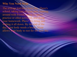 The document discusses why sleep is important for kids. It states that sleep allows the body and brain to rest and recharge for the next day. The brain may sort information and solve problems during sleep. Most kids between 5-12 need 10-11 hours of sleep per night. Younger kids (3-6 years old) typically need 10-12 hours while older kids (7-12 years old) need 10-11 hours. Teenagers (12-18 years old) need 8-9 hours but may benefit from more.
