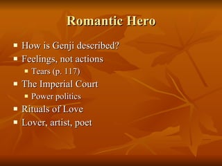 The document provides background information on The Tale of Genji, including details about its author Murasaki Shikibu, the Heian period court society in which it was set, and key literary figures and salons of the time. It summarizes some of the main themes and structure of The Tale of Genji, including its focus on the life of the shining prince Genji, themes of impermanence and longing, and how it was one of the first novels and psychological works of its time.