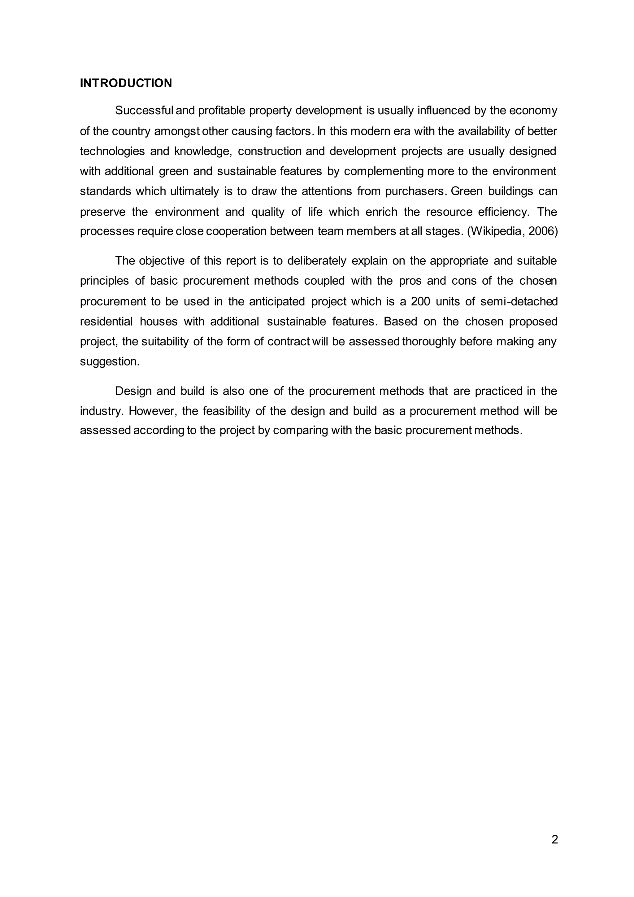 This document discusses different procurement methods for a proposed 200-unit semi-detached residential housing project with sustainable features. It recommends the traditional procurement method, assessing the suitability of traditional, management contracting, and design-build approaches. It suggests using a lump sum contract with quantities and the PAM Contract 2006 standard form. Design-build is also described, outlining its potential benefits like single point responsibility but noting developers in Malaysia commonly prefer traditional procurement.
