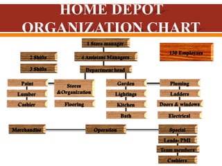 Home Depot has a large staff management structure to ensure excellent customer service. It was founded in 1978 and has expanded significantly over the decades. The company focuses on its core values of customer service, community involvement, and ethical conduct. Home Depot employs various strategic planning approaches and uses technology extensively to manage its inventory and supply chain effectively.