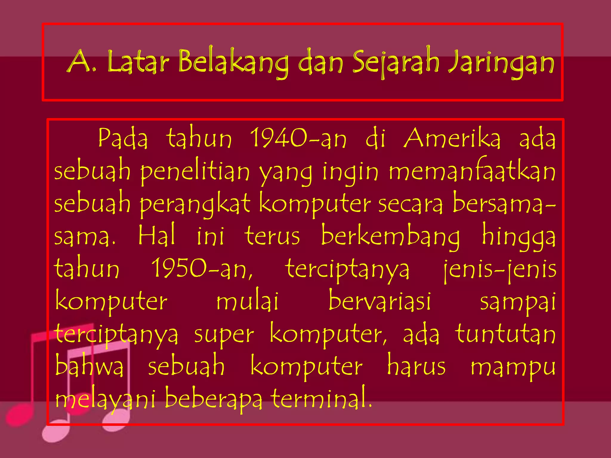Dokumen ini memberikan penjelasan tentang latar belakang dan sejarah jaringan komputer, termasuk perkembangan teknologi dari tahun 1940-an hingga saat ini, serta berbagai jenis jaringan seperti LAN, MAN, WAN, internet, dan jaringan tanpa kabel. Selain itu, dokumen ini juga menjelaskan berbagai topologi jaringan dan model OSI, yang mencakup tujuh lapisan dan fungsinya dalam komunikasi data. Setiap jenis jaringan dan topologi memiliki karakteristik yang unik, kelebihan dan kekurangan masing-masing.