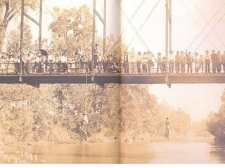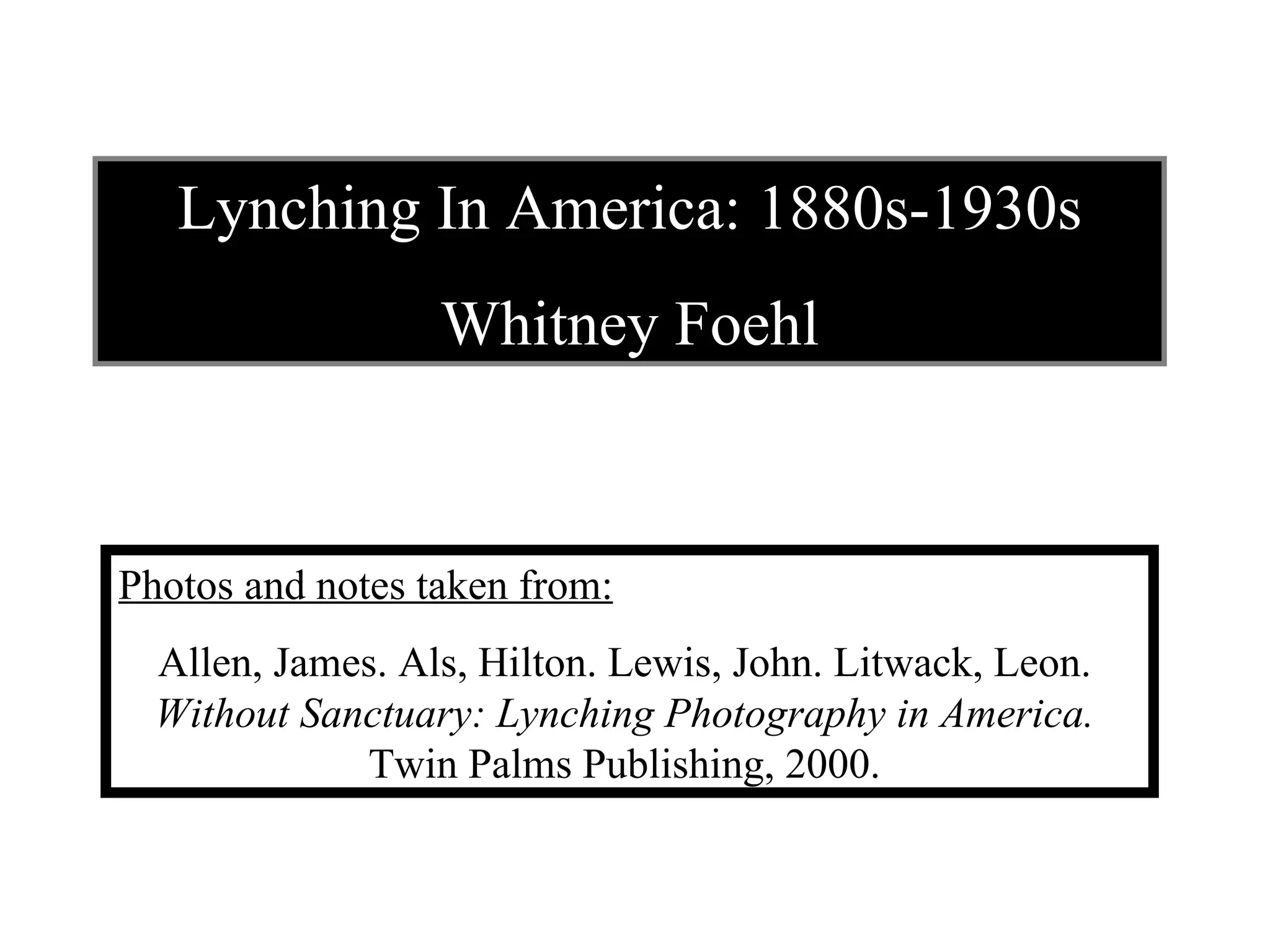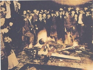 The document discusses lynching in America from the 1880s to the 1930s. It provides photos and notes from the book "Without Sanctuary: Lynching Photography in America" which documents lynching during this era. The photos show lynchings that occurred in various states and include images of murdered victims as well as crowds gathered at lynching events.