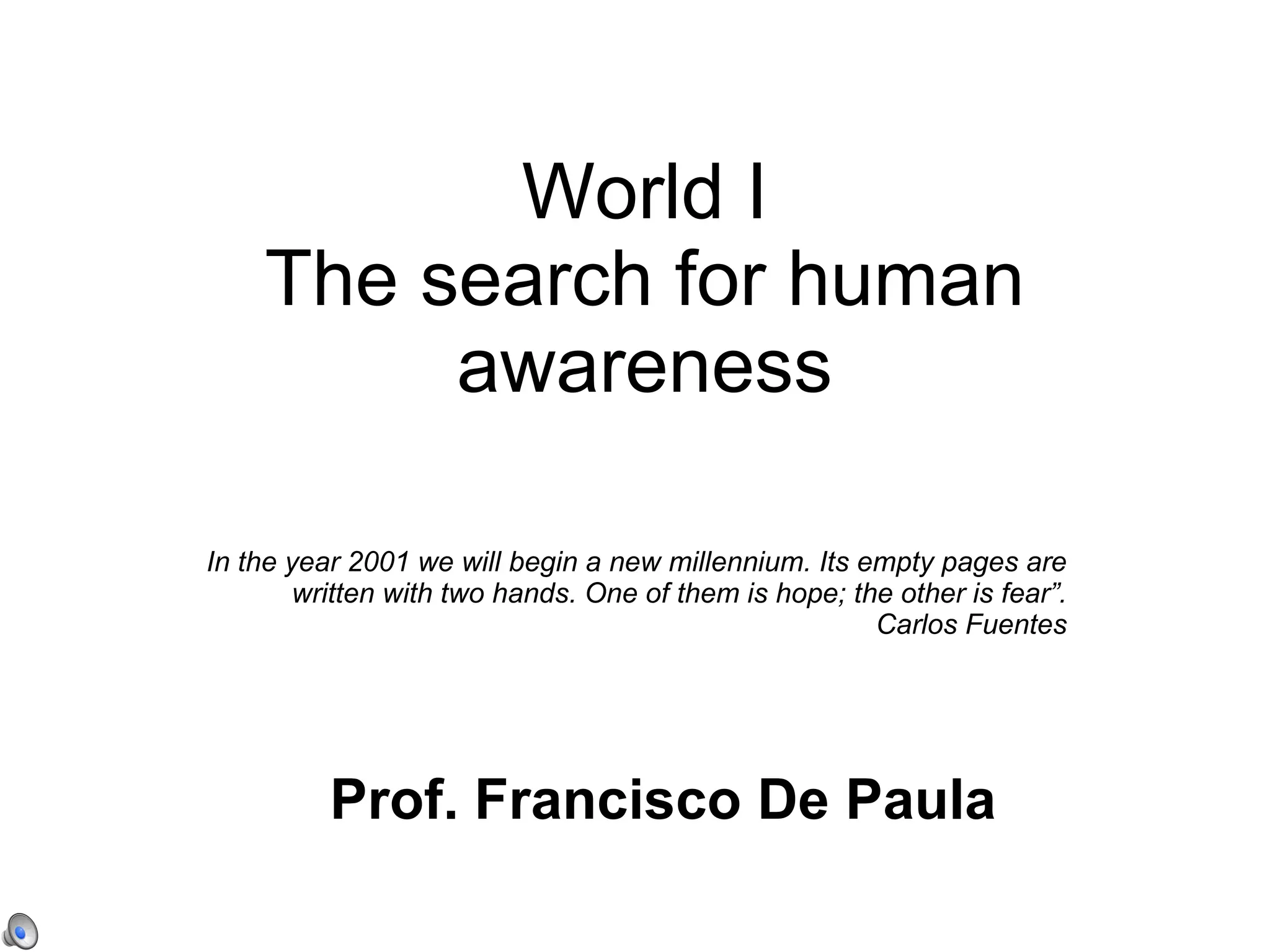 The document discusses the evolution of human self-consciousness and awareness. It argues that we have reached a point where humanity must take responsibility for guiding its own evolution through conscious decision making, rather than relying on natural selection. As the first generation with a globalized world and the ability to threaten our own existence, we must work to eliminate human evils like inequality and irrational concentration of power in order to build a sustainable civilization of self-awareness.