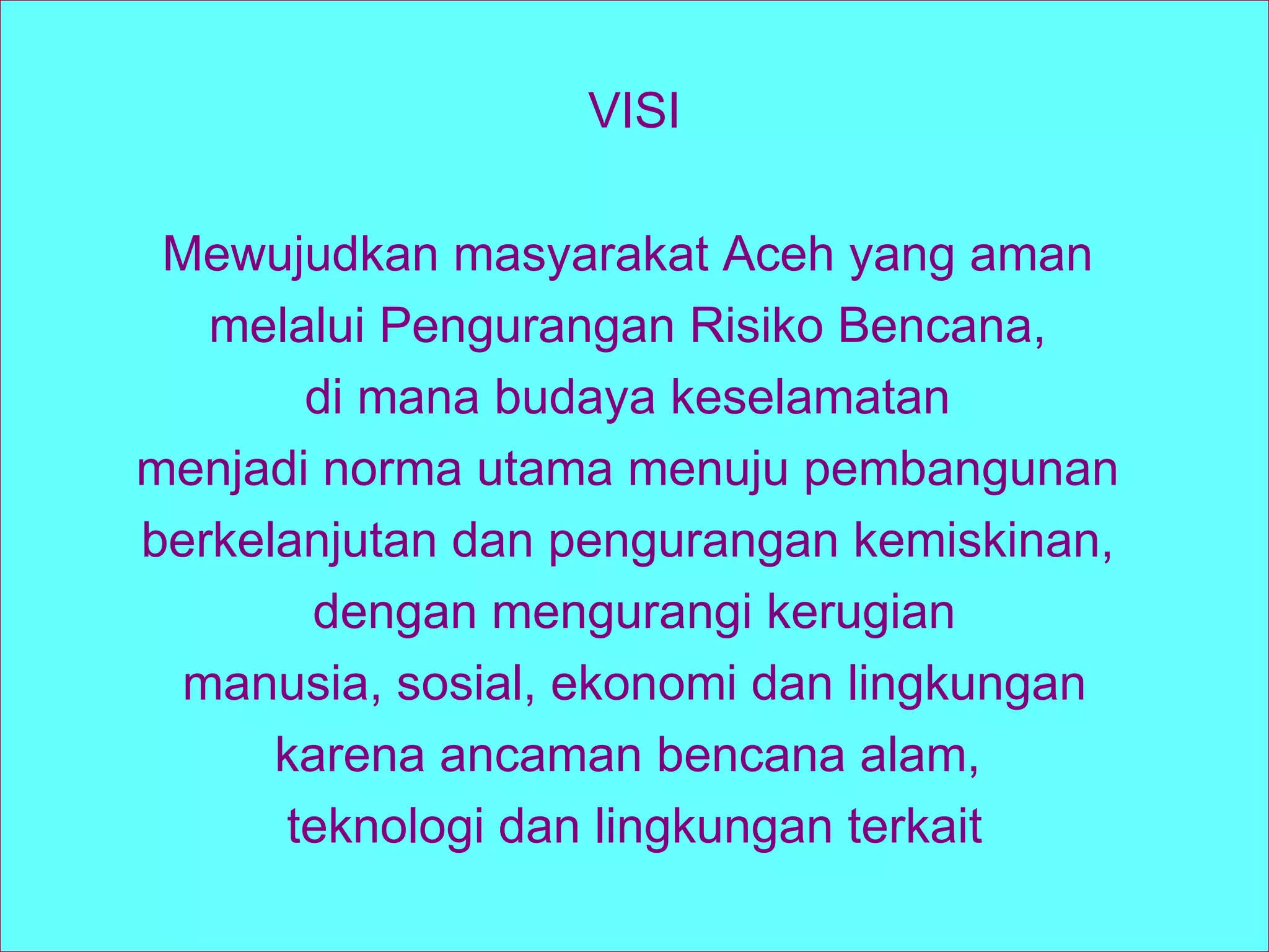 Dokumen ini membahas visi dan misi untuk mewujudkan masyarakat Aceh yang aman dengan fokus pada pengurangan risiko bencana dan peningkatan kesadaran publik. Terdapat penekanan pada kolaborasi antar berbagai pihak dalam perencanaan dan pelaksanaan kebijakan, serta perlunya kelembagaan yang kuat untuk efektivitas upaya tersebut. Komite penyadaran prb Aceh dibentuk untuk meningkatkan koordinasi dan kapasitas dalam pengurangan risiko bencana di seluruh sektor.