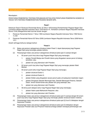 Peraturan Pemerintah Republik Indonesia Nomor 44 Tahun 2011 mengubah batas usia pensiun bagi pegawai negeri sipil sesuai dengan jabatan yang diemban. Pegawai negeri sipil yang menjabat sebagai wakil menteri dapat memperpanjang usia pensiun hingga 62 tahun, dengan ketentuan-ketentuan tertentu. Peraturan ini mulai berlaku pada tanggal diundangkan, yaitu 30 November 2011.