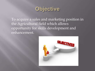 The document provides a summary of the applicant's experience and qualifications for a sales and marketing position in the agricultural field. The applicant has over four years of experience in agricultural sales, marketing, and customer service. They also gained farming skills while working on a university research farm in beef and crop development. The applicant holds a B.S. in Agricultural Communications and completed a manager trainee program.