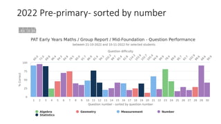 This document contains results from 2022 pre-primary math questions sorted in different ways, including by number, question difficulty, math strand, and percentage correct. The results provide insight into student performance on early years math assessments across multiple categorizations.