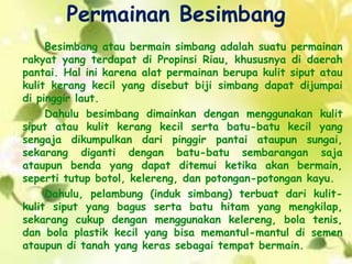 Permainan tradisional Besimbang berasal dari Riau yang menggunakan bahan seperti kulit siput atau batu kecil. Tujuan permainan ini adalah untuk membantu siswa memahami konsep matematika dasar seperti penjumlahan, pengurangan, perkalian, dan pembagian, serta membangun kerja sama antar pemain. Aturan dan cara bermain ditetapkan dengan melingkarnya pemain dan pelambungan biji simbang.