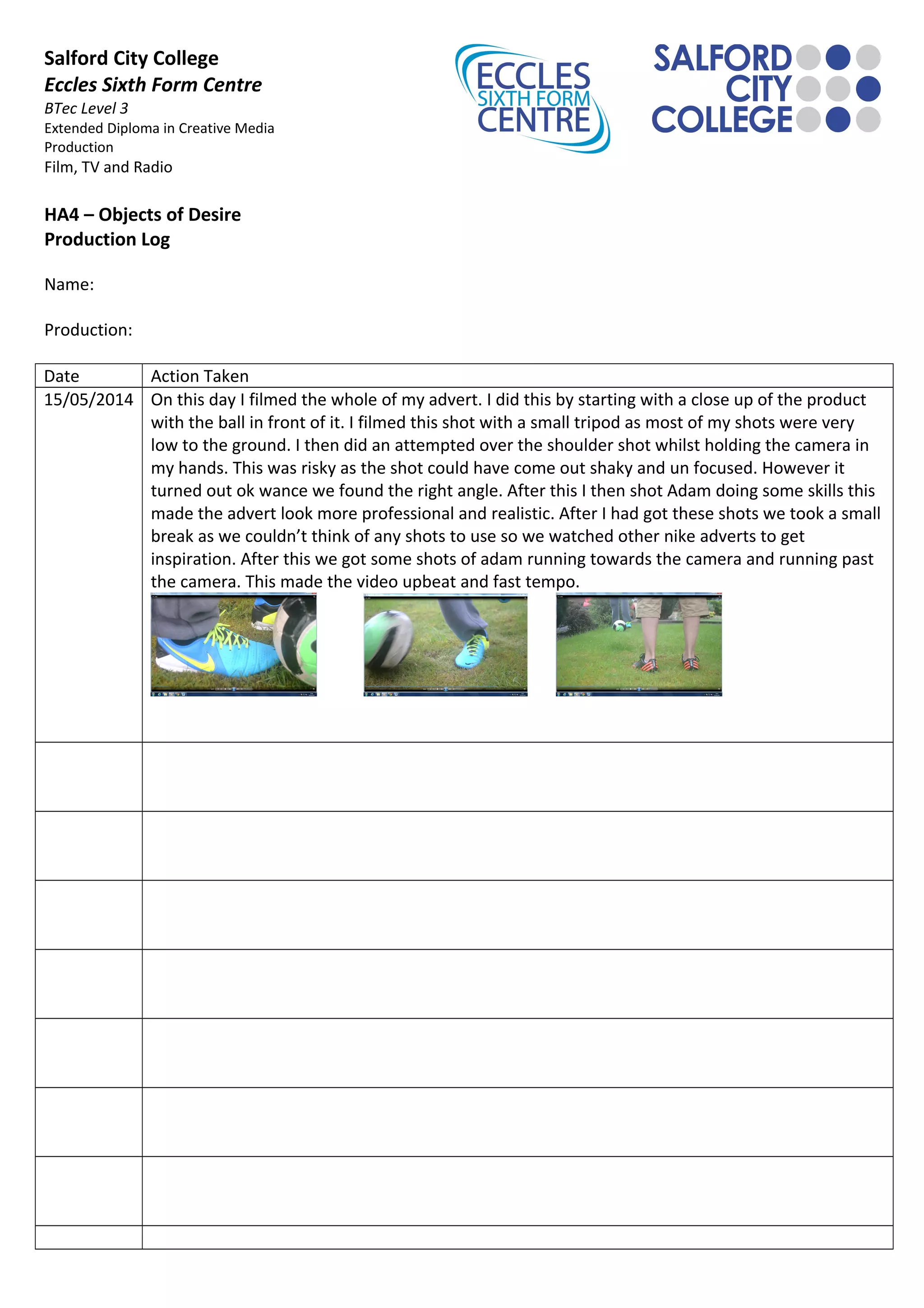 Salford City College Eccles Sixth Form Centre BTec Level 3 Extended Diploma in Creative Media Production Film, TV and Radio HA4 – Objects of Desire Production Log Name: Production: Date Action Taken 15/05/2014 On this day I filmed my entire advert, starting with close-ups of the product using a small tripod, then an over-the-shoulder handheld shot of Adam doing skills to make it look professional, and finally shots of Adam running towards and past the camera to make the video upbeat.