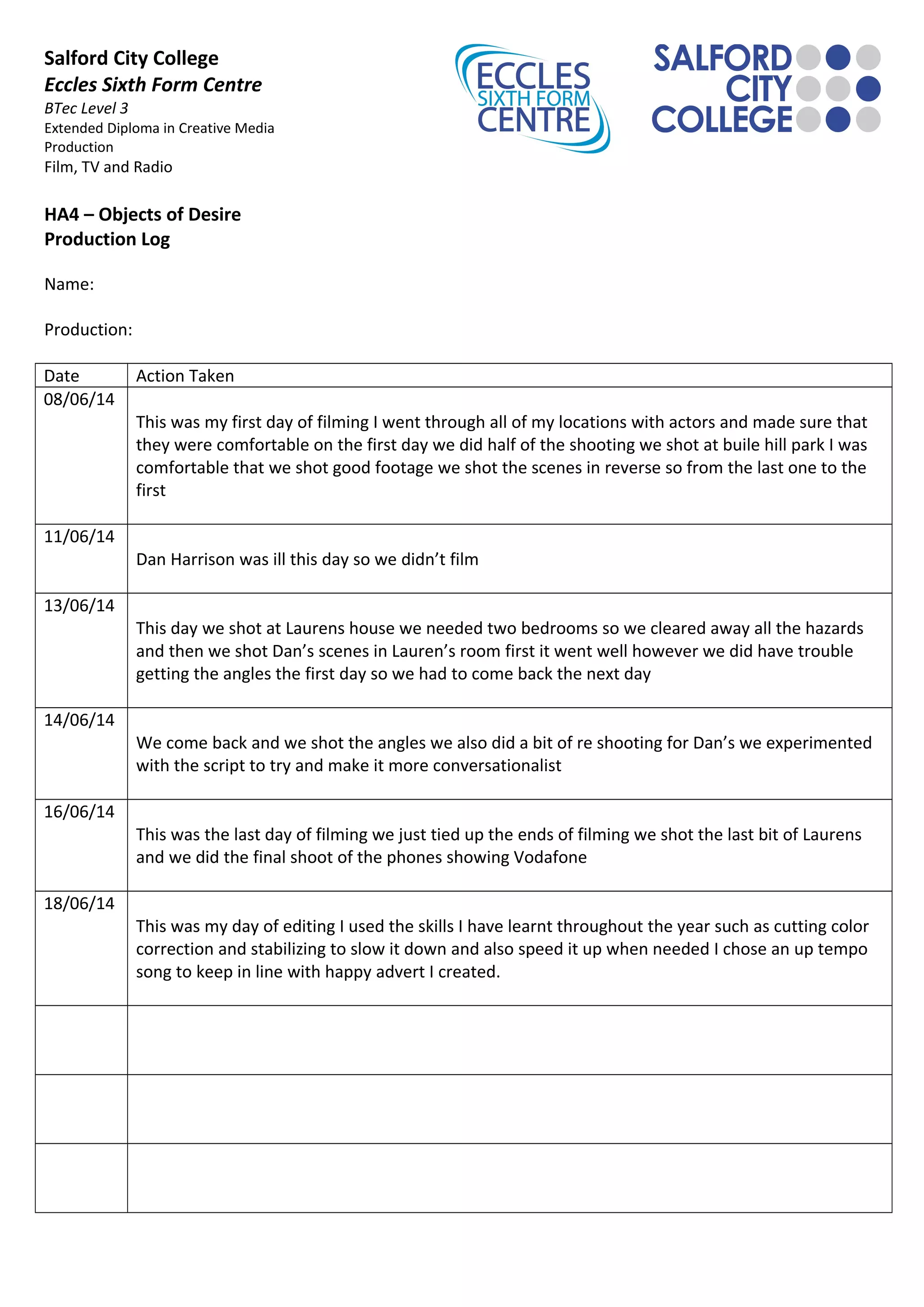 This production log documents the filming of a creative media project over several days. On the first day of filming, the director went through locations with actors and shot scenes in reverse order at Buile Hill Park. Filming was cancelled one day when an actor fell ill. On another day, scenes were shot at a house after clearing hazards, though some reshoots were needed the next day to get the right angles. The last filming day wrapped up remaining scenes. In editing, the director utilized color correction, stabilization, and speed/slow motion effects to an uptempo song to create a happy advert in line with the project.