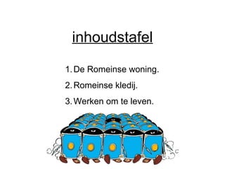 Werken om televen: - Wat bracht de Romeinse landbouw voort? werkgelegenheid opbrengsten: -groententuin -boomgaard -kruidentuin -bloementuin (werd gebruikt om bloemenkransen te kunnen leggen op de familiealtaren) -veeteelt -luxeproducten: wijn & olijven