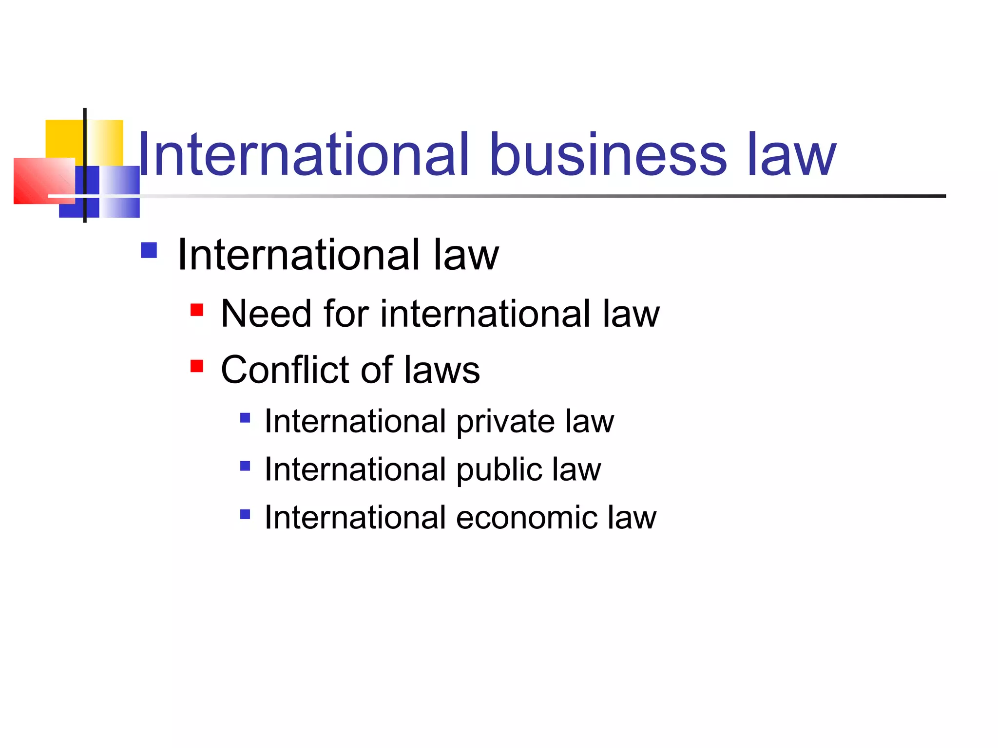 International business law covers many topics including international law, conflict of laws, and economic law. The document outlines the key concepts of international law including what international law is, how it is made through treaties and customs, its sources, scope of application, and subjects like states, international organizations, and individuals. International law governs relationships between states, persons and states, and persons with each other. It is a binding legal system created through the consent of states based on their practice and beliefs.