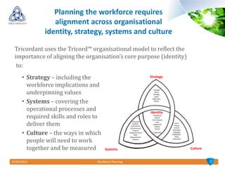 The document outlines a workforce planning framework utilizing the tricordant model, highlighting the importance of aligning organizational identity, strategy, systems, and culture. It discusses the stages of workforce strategy development, different workforce models, and the implications of supply and demand in the higher education sector. Key considerations include resource management, talent development, and the impact of changing workforce needs within academic institutions.