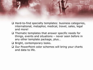 This presentation describes a package of PowerPoint templates that offers hard-to-find specialty templates from various business categories and industries. It provides thematic templates tailored to specific needs, situations, things and events. The templates have bright, contemporary color schemes that bring charts and data to life.