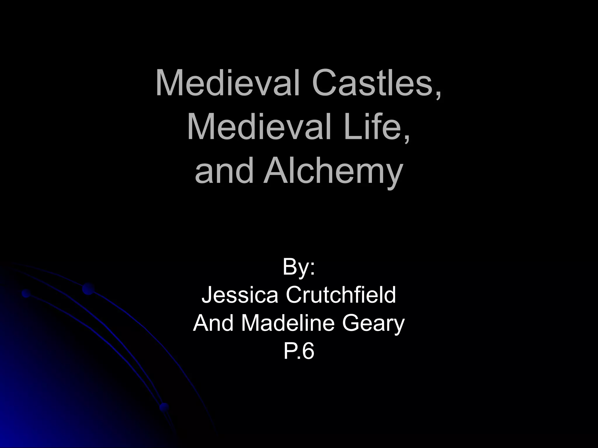The document discusses medieval castles, life in castles, and alchemy. It describes features of castles like moats and halls. Life in castles was uncomfortable without central heating. Alchemy was an early form of chemistry that focused on transforming elements and was practiced in places like China, Arabia, and Greece in hopes of achieving immortality or medicine. Isaac Newton later advanced alchemy into early chemistry.