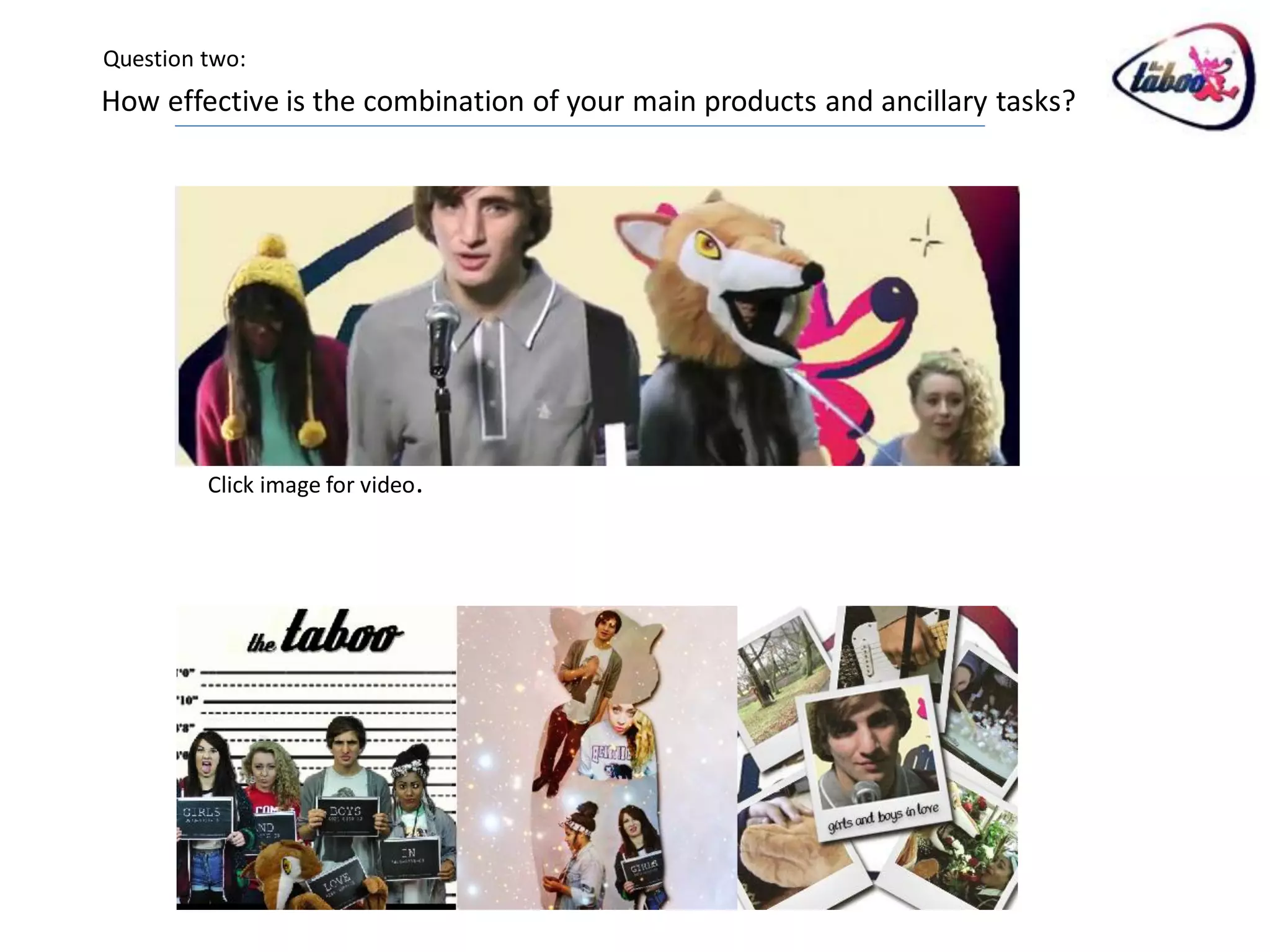 The student created a brand image for their fictional band using various elements in their music video and ancillary products. They aimed to portray the band as fun, quirky, and different from other indie-pop bands. Key elements of the brand image included the use of a fox costume, consistent colors, fonts, and repetition of visuals across products. Audience feedback indicated that the brand image successfully conveyed the desired qualities and was unique, especially the fox costume. Minor improvements such as using real musicians were suggested, but overall the branding was deemed effective.