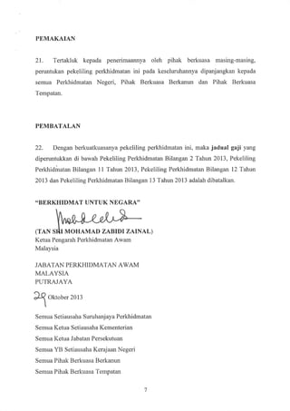 Pekeliling Perkhidmatan Bilangan 36 Tahun 2013 menggariskan penambahbaikan jadual gaji minimum-maksimum bagi gred 1 hingga 54 di bawah Sistem Saraan Malaysia, bermula 1 November 2013. Tujuan utama adalah untuk memastikan penggajian yang mengambil kira kelayakan dan menjamin kualiti kepegawaian yang tinggi. Pelaksanaan melibatkan prinsip penggantian gaji dan pemindahan gaji bagi pegawai yang layak.
