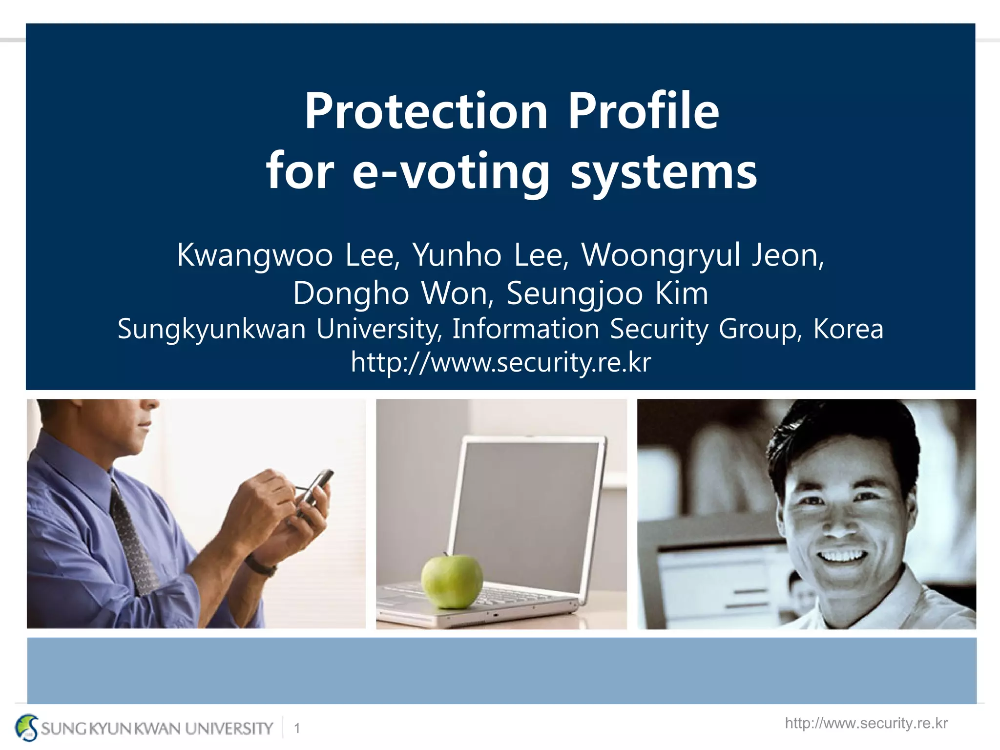The document presents a protection profile for e-voting systems, detailing various types of e-voting, their processes, and security requirements. It addresses issues of voter verifiability and security risks, emphasizing the need for confidence in election outcomes through evaluation against Common Criteria standards. The paper concludes with a call for improved protection profiles that incorporate verifiable voting mechanisms.