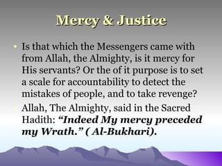 The message of Islam is one of mercy for all mankind. The Prophet Muhammad was sent as a mercy and the best example of noble character. The aim of Islam's message and acts of worship like prayer, fasting, zakat, and Hajj is to develop good character and conduct towards Allah and other people. True faith is shown through righteous actions and treating others with compassion.