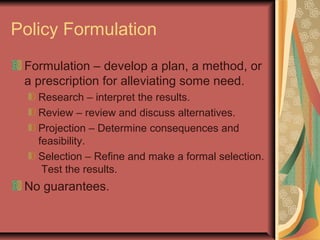 The document discusses the process of policy formulation. It begins by defining formulation and outlining the typical steps: research, review alternatives, project consequences, select and refine options, and test results. It notes formulation can involve various actors and occur over long periods without full support coalescing around any proposal. The types of formulation discussed include rational planning vs subjective reacting and comprehensive vs segmental approaches. Key factors in the process include the involved sources inside and outside of government as well as institutional limits. Formulation is described as both a strategic and legitimizing process that aims to develop supported policy solutions.