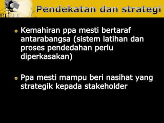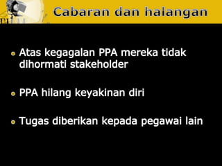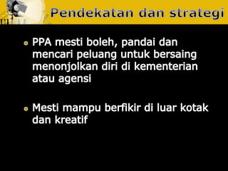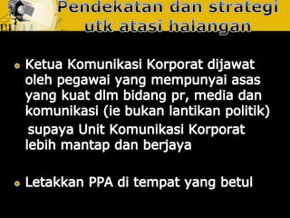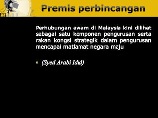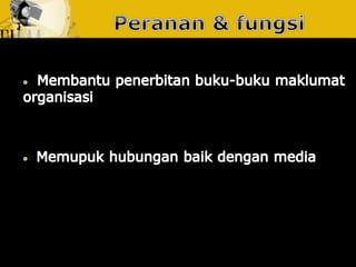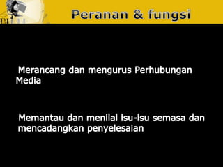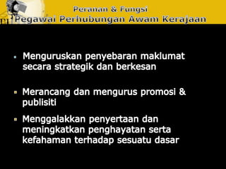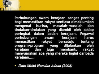 Dokumen ini membincangkan usaha yang dirancang dan berterusan untuk menjalin dan mengekalkan hubungan baik dan pemahaman antara organisasi dengan awam. Ia menjelaskan tentang fungsi perhubungan awam sebagai pengurusan yang berterusan dan berancang, serta pentingnya mendapatkan akreditasi daripada badan yang diiktiraf seperti Institut Perhubungan Awam Malaysia. Tujuannya adalah untuk meningkatkan kerjasama dan penyelesaian yang lebih cekap untuk kebaikan bersama.