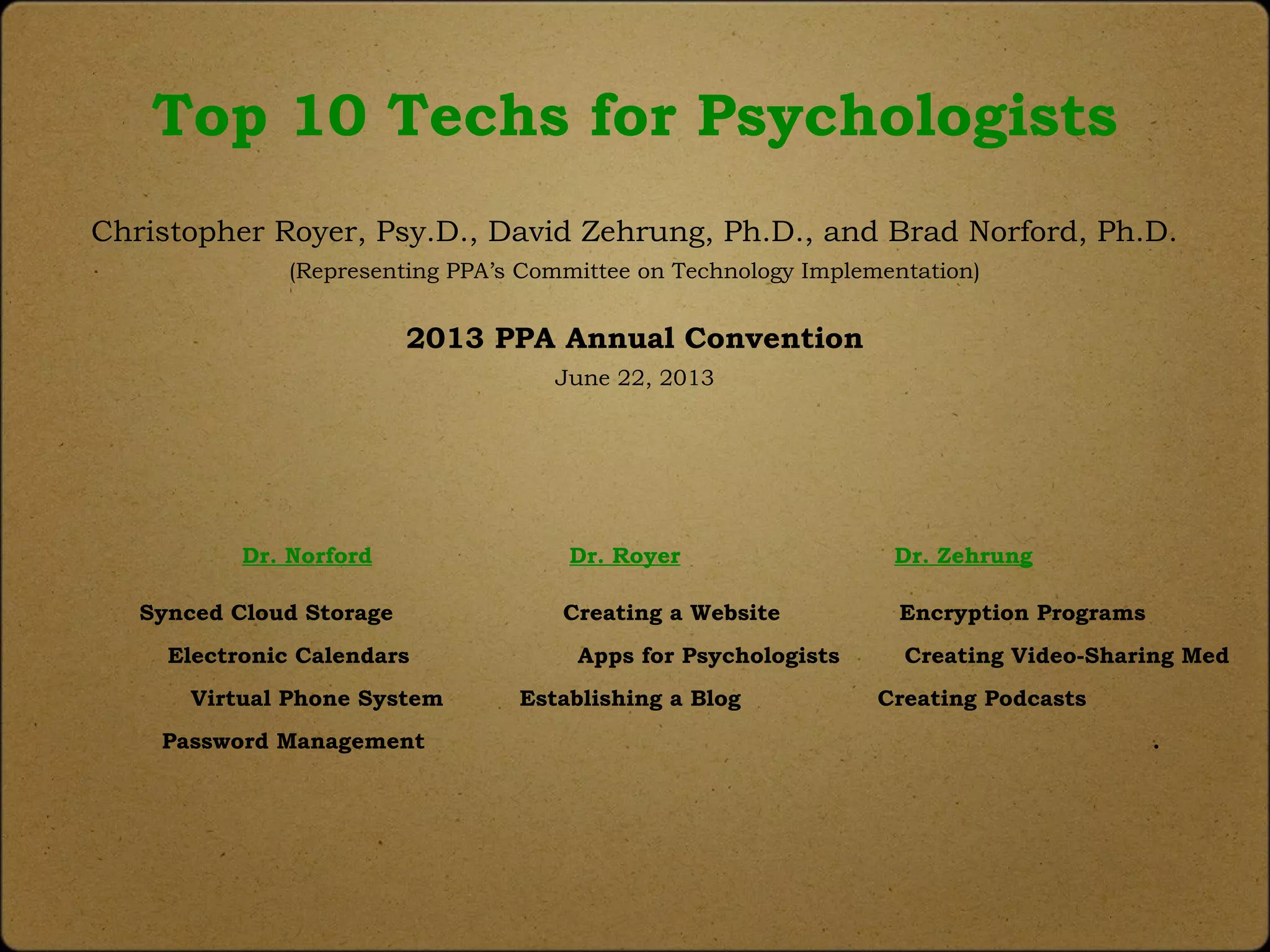 The document outlines the top 10 technologies for psychologists, focusing on tools such as synced cloud storage, electronic calendars, virtual phone systems, and password managers. It emphasizes the importance of security and offers practical steps for ensuring the safety of online information, including password management and data backup strategies. Commonly used services and recommendations for enhancing security practices are also included.